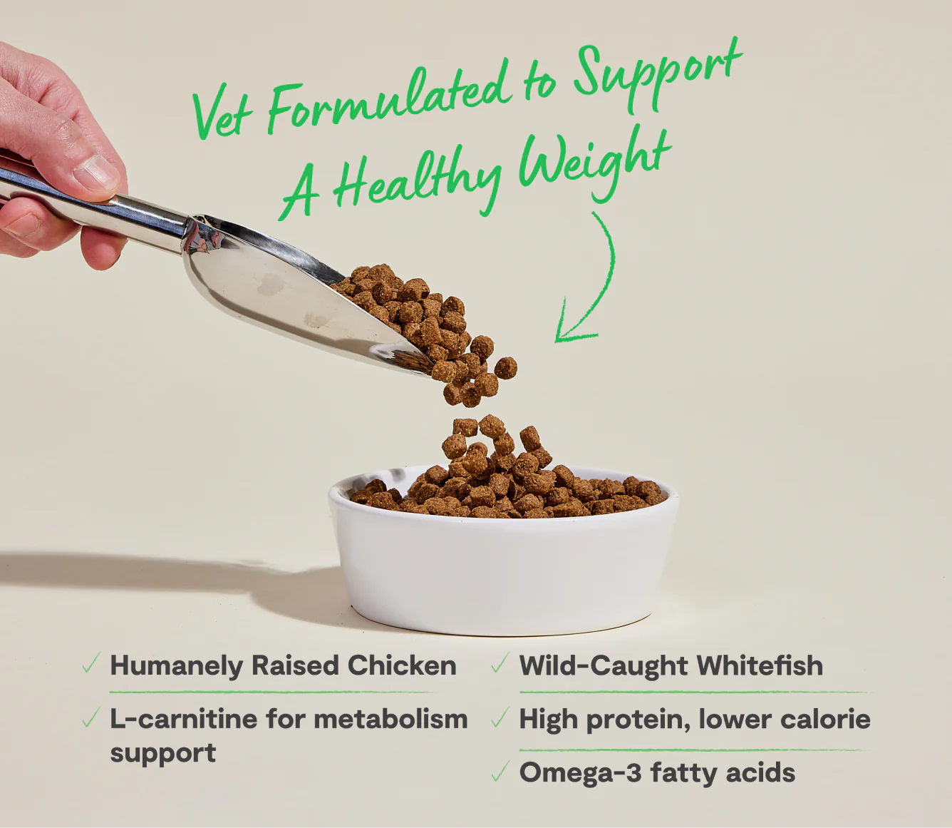 This vet-formulated kibble provides high protein, low calorie nutrition to help support a healthy weight and maintain lean muscle mass. Made with lean protein sources of G.A.P certified chicken and Ocean Wise® recommended wild-caught whitefish, this complete and balanced meal includes more fiber and less fat compared to other Open Farm recipes to support your dog's metabolism and maintain a healthy weight.