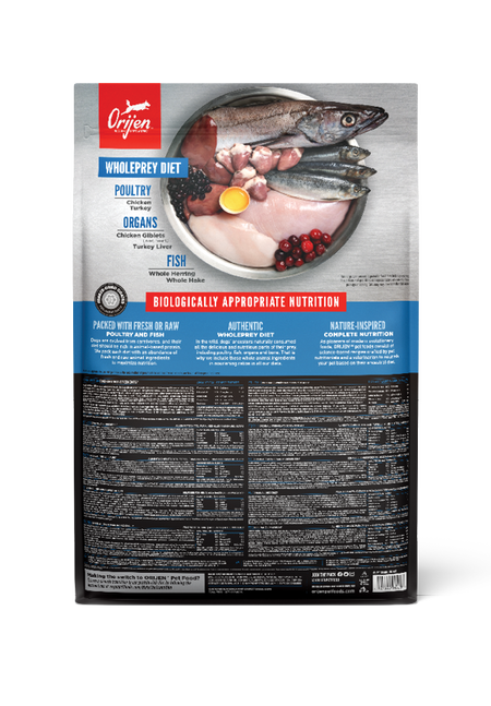 - Our authentic WholePrey diet features the most succulent parts of the prey like poultry or fish, organs and bone to mimic what your dog’s ancestors consumed in the wild.