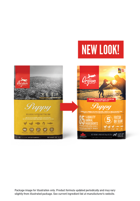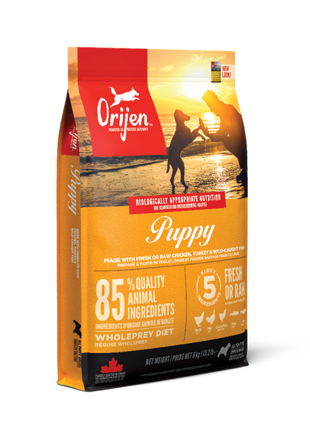 Help your puppy thrive with the power of protein-rich recipes that provide peak nourishment. All puppies do best on a Biologically Appropriate diet rich in protein and fat from quality animal ingredients to support their development. ORIJEN® Puppy diet is packed with 85%1 quality animal ingredients like fresh or raw free-run2 chicken and turkey, and wild-caught or sustainably farmed fish. Packed with WholePrey animal ingredients like organs and bone, ORIJEN food is made with the most nutrient-dense, succulent parts of the prey to deliver the nutrition puppies need. The result is a diet for your canine companion that is beyond comparison.