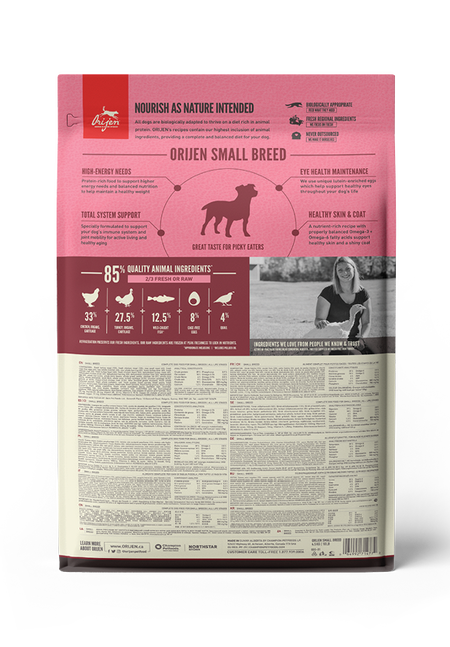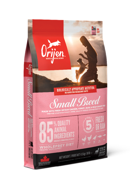 Help your dog thrive with the power of protein-rich recipes that provide peak nourishment. Your small-breed dog has certain nutritional needs and requires a Biologically Appropriate diet in order to thrive. ORIJEN® Small Breed diet is made specifically for smaller dogs, with nourishing protein from free-run1 chicken and turkey, wild-caught fish and quail all packed into a unique kibble shape that is easier for them to eat. Packed with fresh or raw2 WholePrey animal ingredients, ORIJEN food is made with the most nutrient-dense, succulent parts of the prey to deliver the nutrition dogs need. The result is a diet for your small canine companion that is beyond comparison.