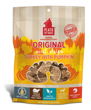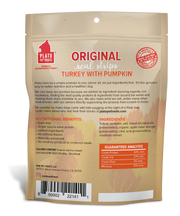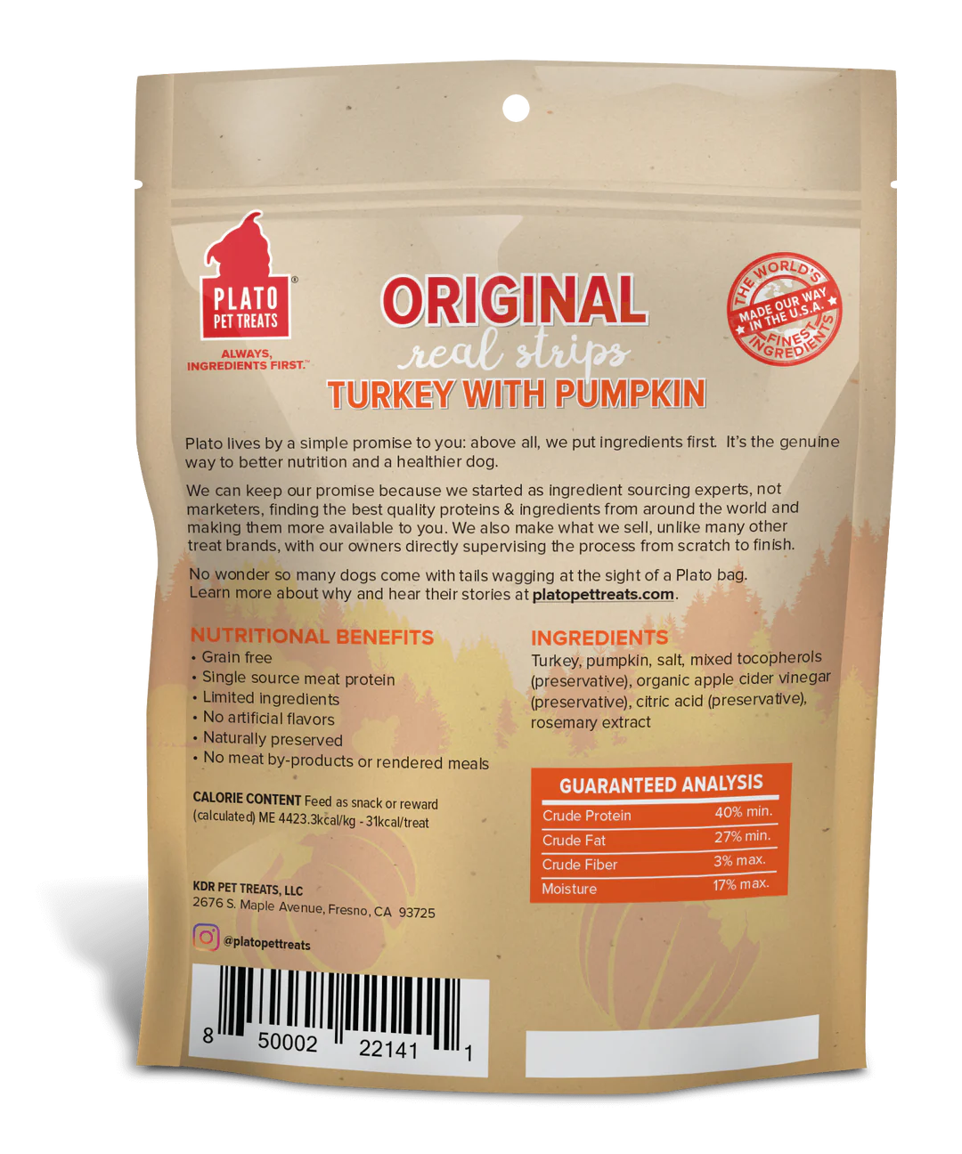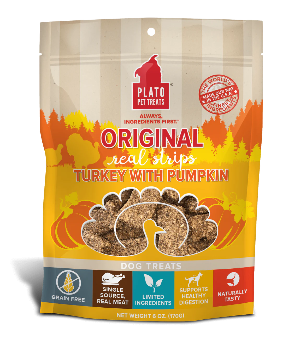 These treats are made for chomping. Real Strips Grain Free Turkey With Pumpkin are soft textured, meat bars that support healthy digestion and are just the right portion size and shape for chomping. Made with real turkey as the 1st ingredient, these treats are grain free, made with limited ingredients, are naturally preserved, and contain no artificial flavors, corn, wheat, or soy. They are easy to chew as is or can broken into smaller pieces for dogs of all sizes. And we take the extra time to air-dry them in batches in our USA facility instead of baking them in order to retain more of the ingredients’ inherent nutrients (but your dog will just think that they smell and taste amazing). It takes longer, but we think its worth it.