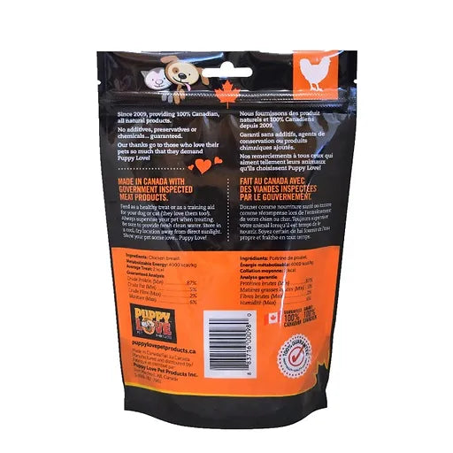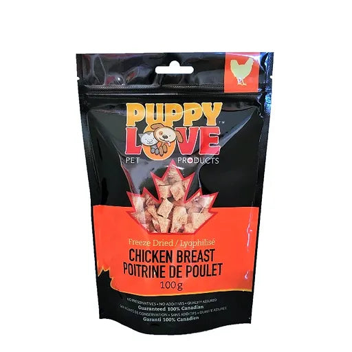 Puppy Love's Freeze Dried Chicken Breast contains only 100% Canadian Chicken Breast with NO additives, preservatives, or chemicals. Through the method of Freeze Drying, the nutritional value of the chicken is maintained. These bite size pieces serve as a convenient snack, training aid, or reward for both dogs and cats. Furthermore, Chicken Breast is an excellent source of protein and low in fat. Prepared and packaged in their southern Alberta facility.