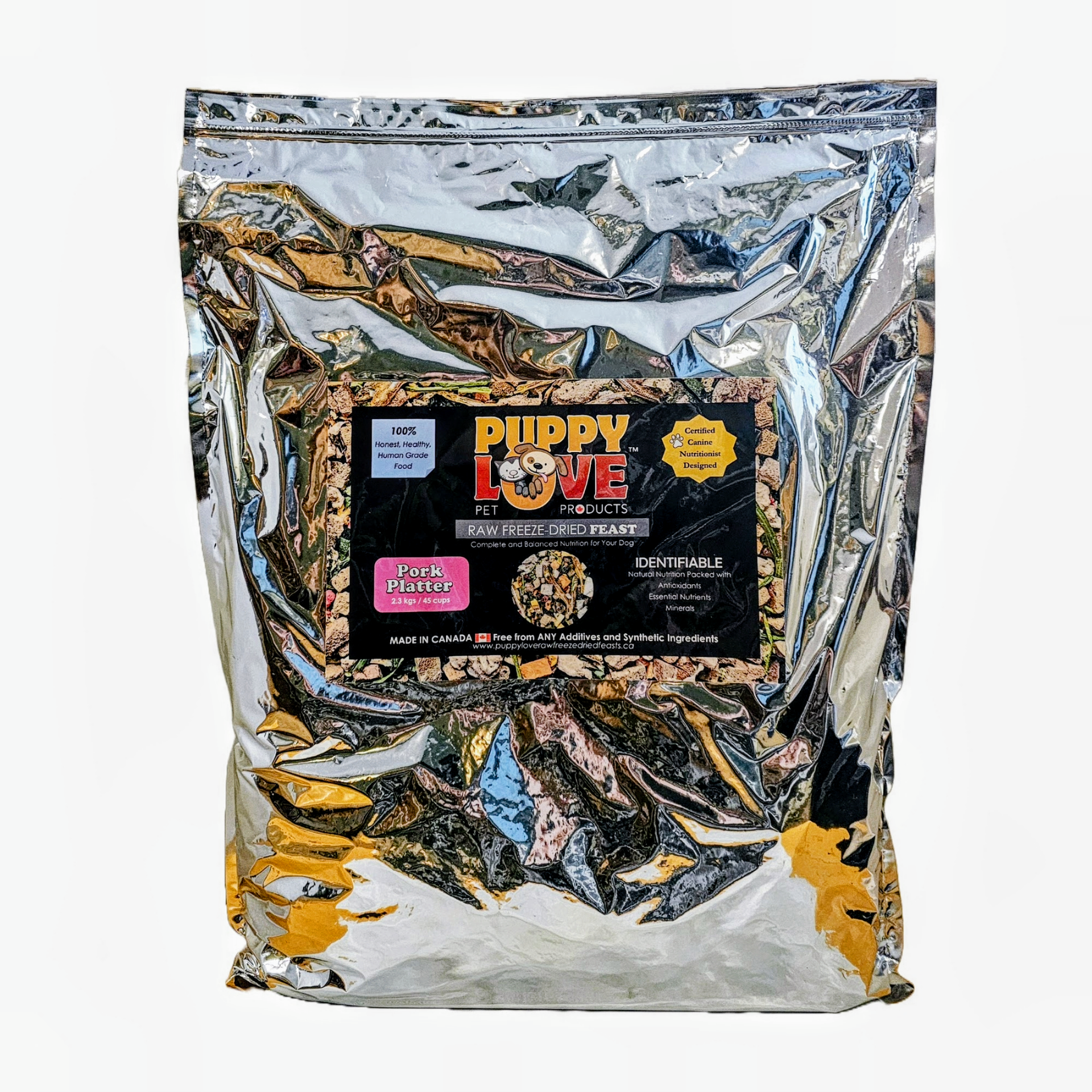 Elevate your pup's diet with Puppy Love Raw Freeze Dried Feast - Pork Platter! This nutrient-rich meal is packed with protein, vitamins and minerals, providing a well-balanced diet for your furry friend. Made with ingredients you can see and formulated by our Certified Canine Nutritionist, this freeze dried food provides all the benefits of raw without any hassle. Watch them thrive and wag their tails with joy as they chow down on this delicious feast!