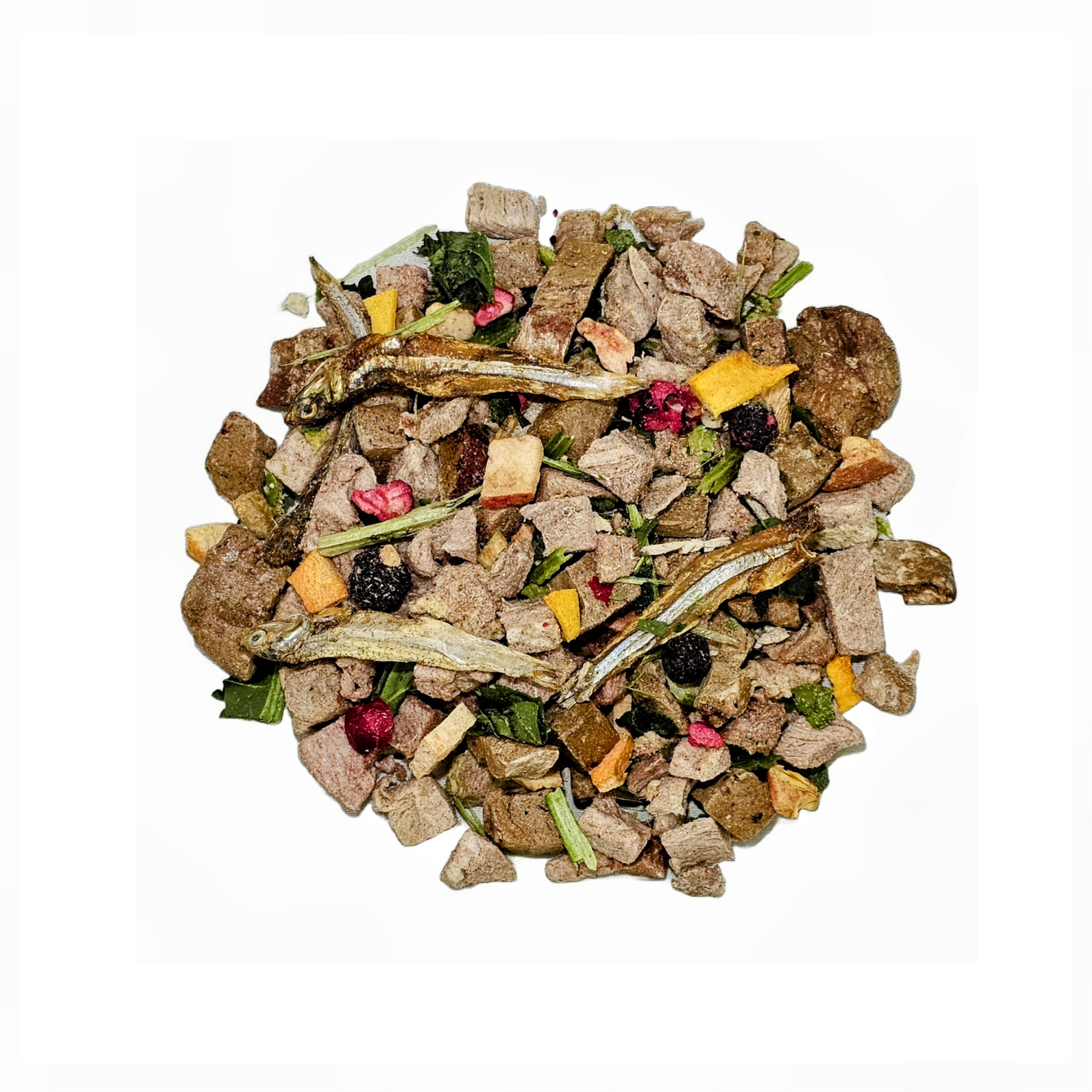 Lean Pork, Beef Liver, Dehydrated Sardines, Fresh Beet Pulp, Fresh Spinach, Fresh Celery, Fresh Pumpkin, Fresh Carrots, Ground Raw Bone, Whole Egg, Raw Crushed Sunflower Seeds, Fresh Apple, Fresh Blueberries, Fresh Cranberries