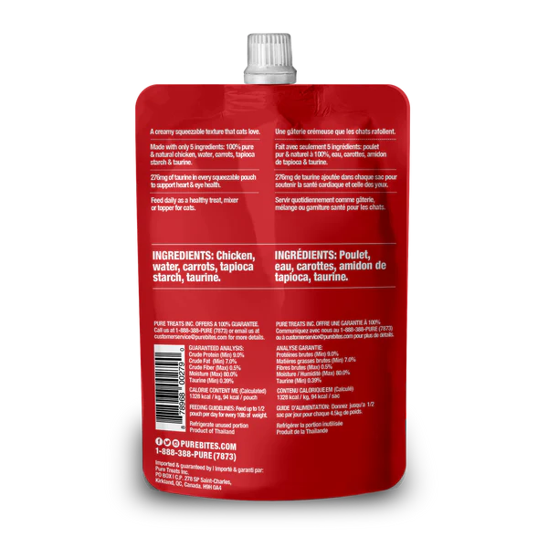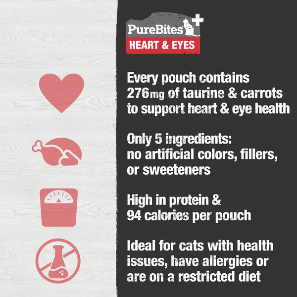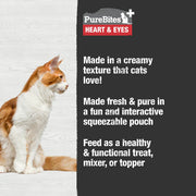 At PureBites, we’re always asking pet parents to “Go ahead, look at our ingredients”. PureBites+ Squeezables Heart & Eyes formula is made with only 5 simple human grade ingredients you can read, pronounce, and trust: 100% pure chicken, water, carrot, tapioca starch, & taurine. No artificial colors, fillers, or sweeteners. PureBites+ Heart & Eyes formula has 276mg of taurine and carrots added to every squeezable pouch to support daily heart & eye health. We make our treats fresh & pure in a creamy texture and in a fun and interactive squeezable pouch, locking in the taste cats crave and superior nutrition that pet parents love.