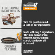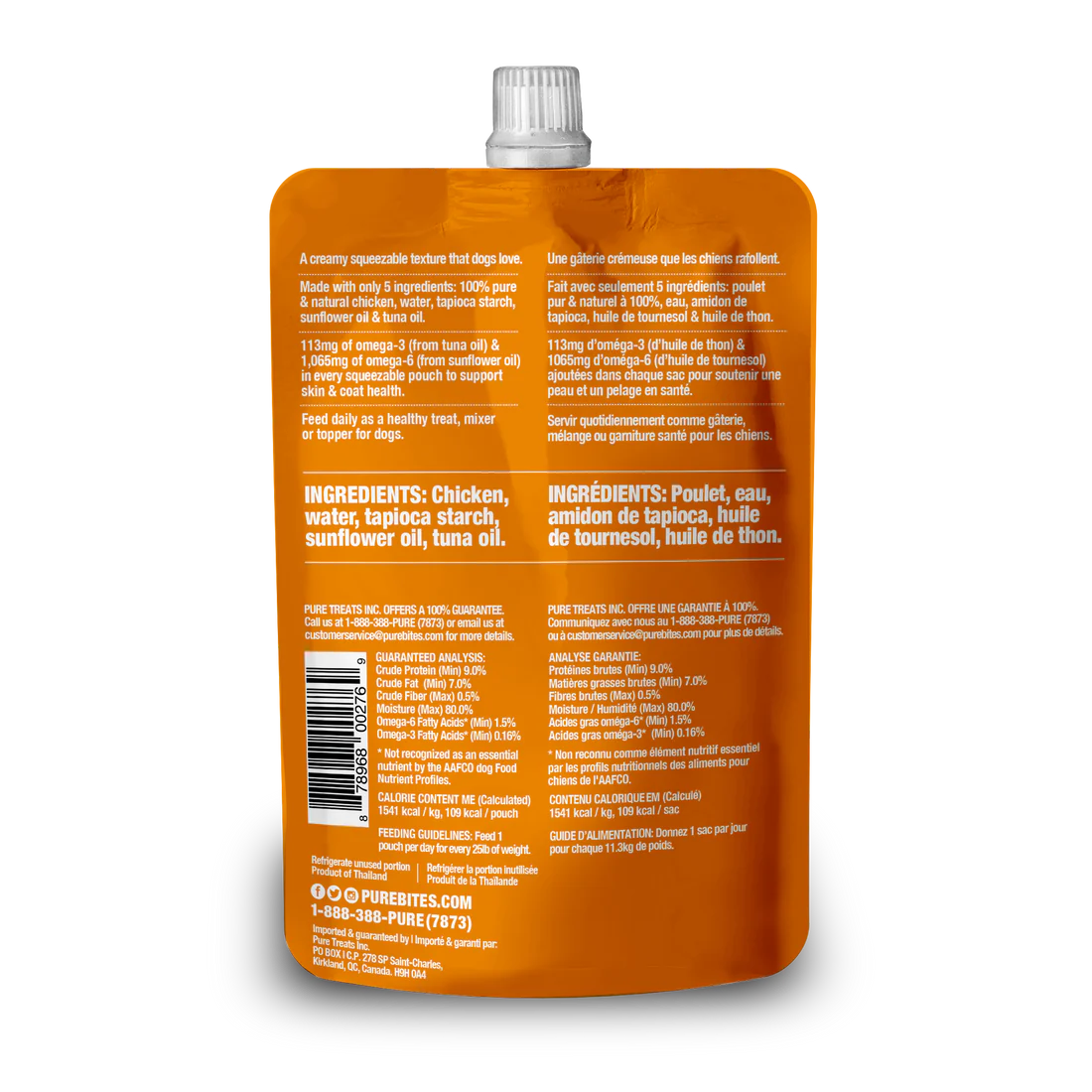 At PureBites, we’re always asking pet parents to “Go ahead, look at our ingredients”. PureBites+ Squeezables Skin & Coat formula is made with only 5 simple human grade ingredients you can read, pronounce, and trust: 100% pure chicken, water, tapioca starch, sunflower oil, & tuna oil. No artificial colors, fillers, or sweeteners. PureBites+ Skin & Coat formula has 113mg of omega-3 and 1065mg of omega-6 added to every squeezable pouch to support daily skin & coat health. We make our treats fresh & pure in a creamy texture and in a fun and interactive squeezable pouch, locking in the taste dogs crave and superior nutrition that pet parents love.