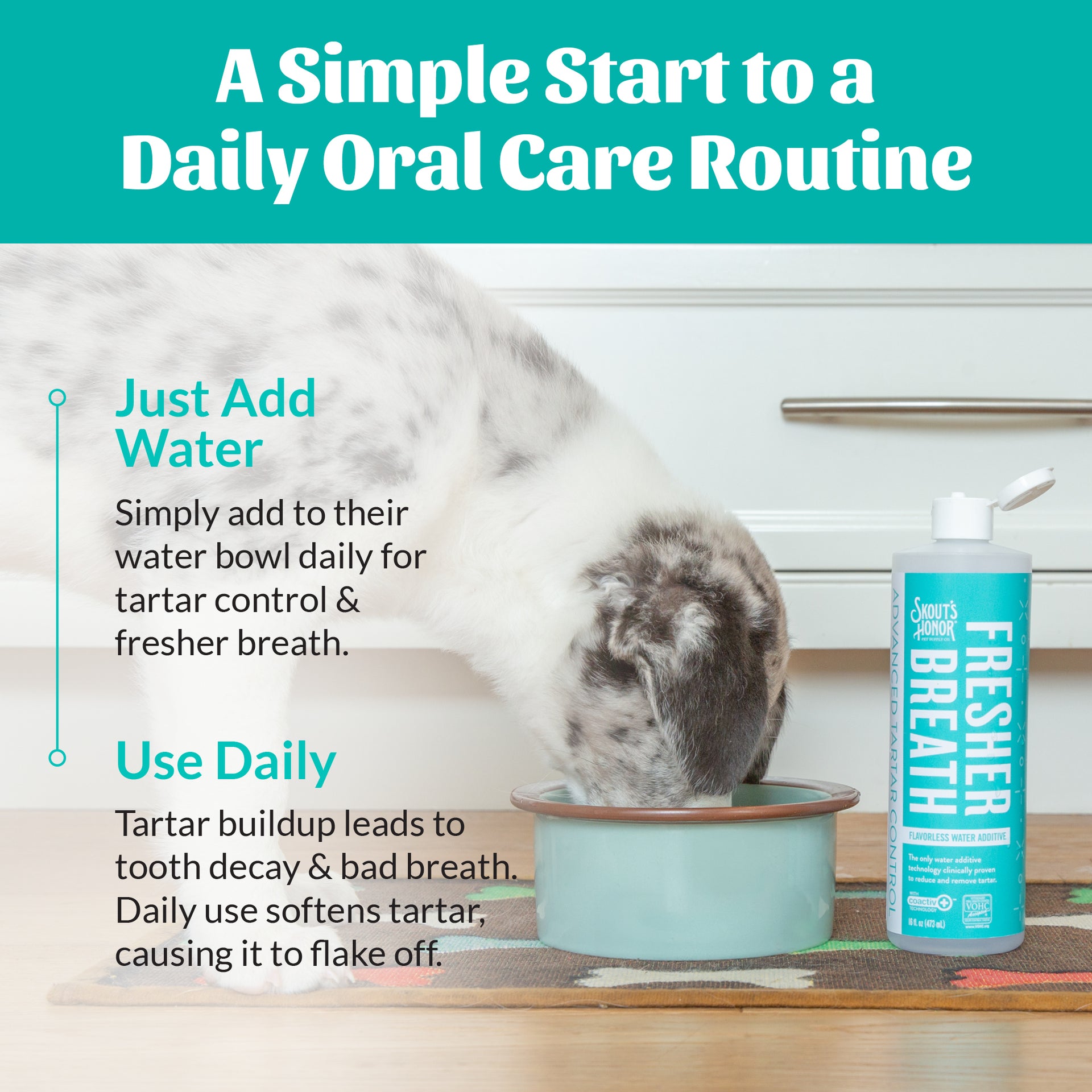 Skout’s Honor’s Water Additive is proven to freshen breath fast, while helping to reduce plaque and tartar at the source. This pet-safe solution makes it easy to create a better oral care routine for your pet - no brushing required! Simply add to their water bowl daily and experience noticeably fresher breath and cleaner teeth.