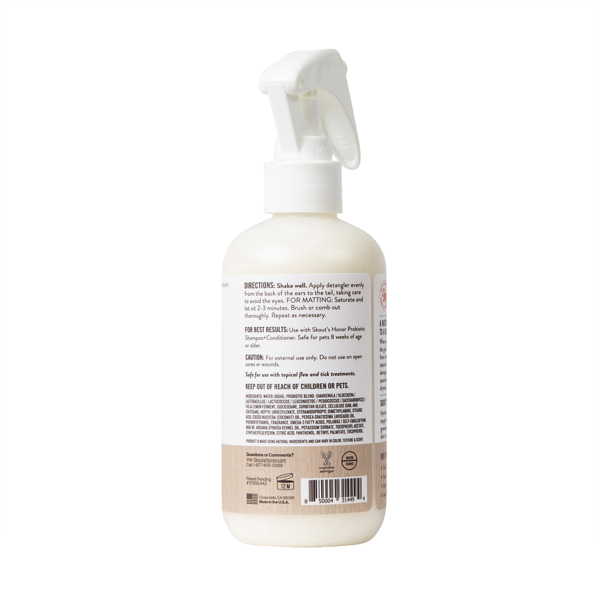 Our dog and cat hair detangler hydrates the skin and softens the coat for a more brushable, tangle-free pet. It contains avocado oil and topical probiotics that help support a healthy microbiome to defend against common skin problems such as itching, odor, dryness, dandruff, hot spots, yeast and excessive shedding.