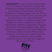 Ingredients: Turkey, Chicken, Chicken Meal, Salmon, Potatoes, Turkey Meal, Chicken Fat (Preserved with Mixed Tocopherols), Miscanthus Grass, Natural Chicken Flavor, Flaxseed, Cranberries, Tomatoes, Apples, Carrots, Chicory Root, Potassium Chloride, Taurine, Ascorbic Acid (Source of Vitamin C), Vitamins (Vitamin E Supplement, Vitamin A Supplement, Vitamin D3 Supplement, Niacin Supplement, D-Calcium Pantothenate, Riboflavin Supplement, Thiamine Mononitrate, Pyridoxine Hydrochloride, Biotin, Vitamin B12 Supplement, Folic Acid), Manganese Proteinate, Choline Chloride, Minerals (Zinc Proteinate, Iron Proteinate, Copper Proteinate, Manganese Proteinate, Calcium Iodate, Selenium Selenite), Dried Bacillus Coagulans Fermentation Product