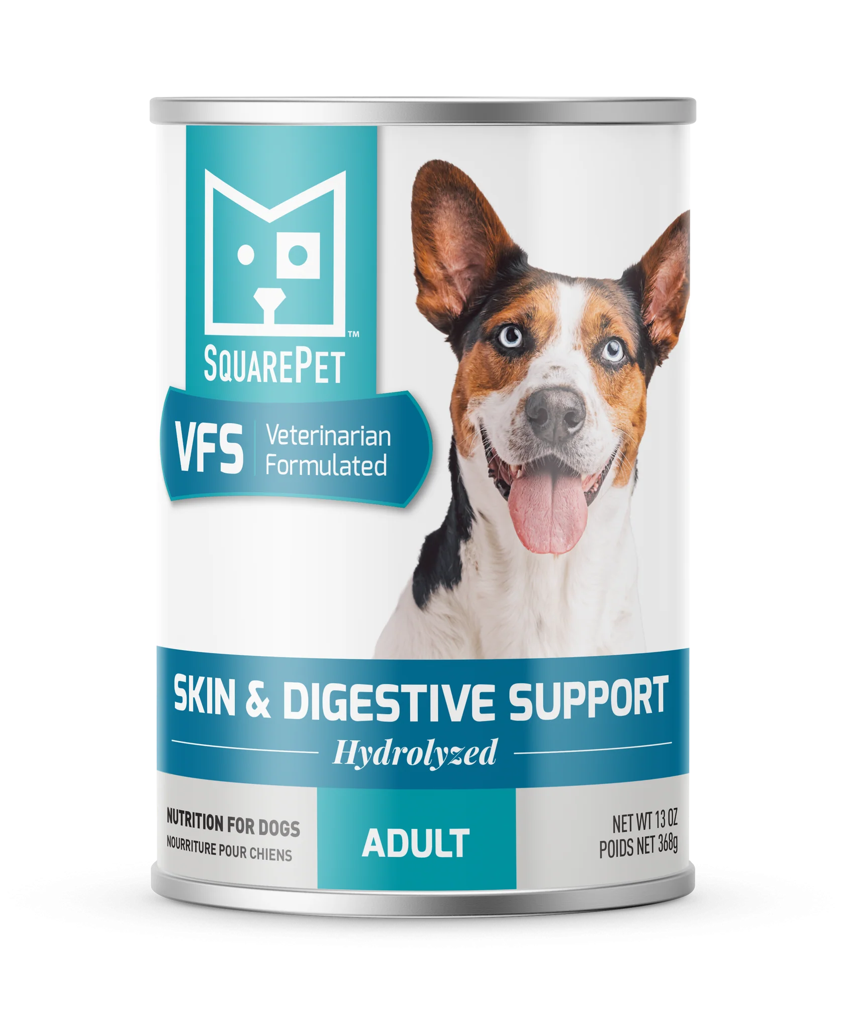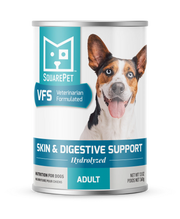 SquarePet® VFS Skin & Digestive Support canned diet has been designed by SquarePet’s team of veterinary professionals to support food sensitivities/ingredient intolerances. VFS Skin & Digestive Support formula for dogs is a unique, limited ingredient, hydrolyzed protein dog food. Similar to proteins used in some infant formulas, hydrolyzed proteins are proteins that have been broken down into smaller components. The result is an exceptionally digestible protein source that can be beneficial for dogs that may be sensitive to common pet food ingredients.