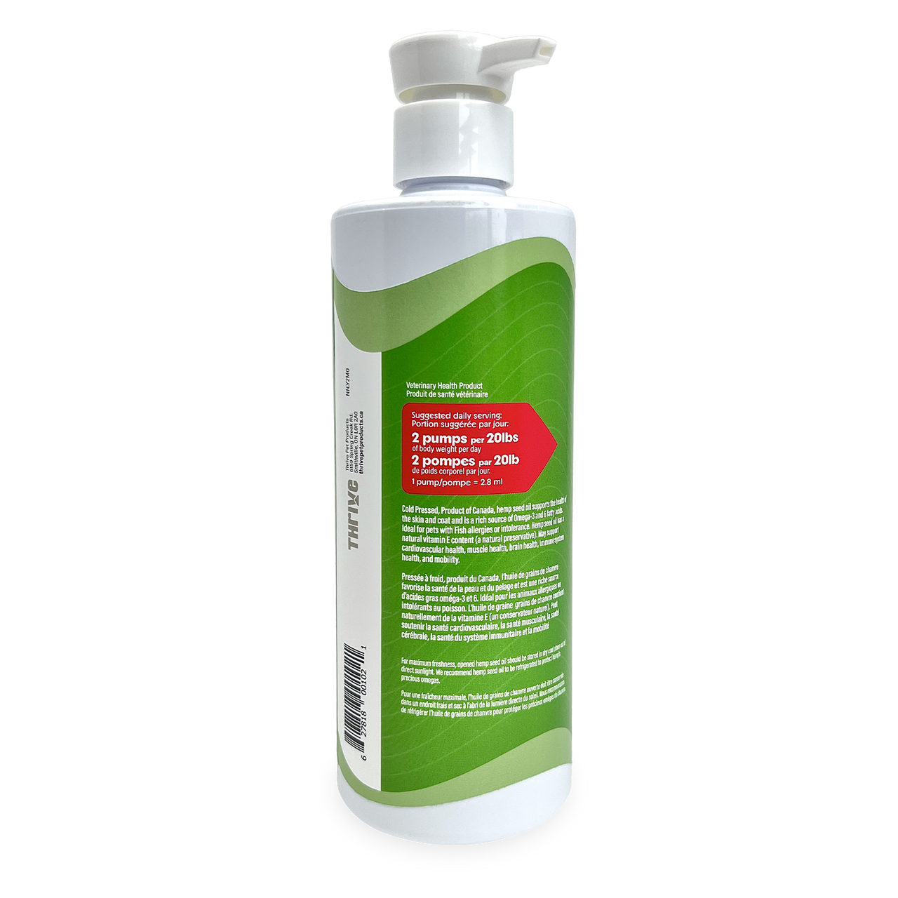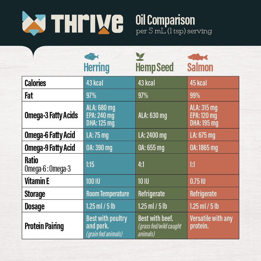 Hemp seed oil is recommended on beef and lamb based recipes, or in rotation with a fish oil (Thrive Herring oil or Thrive Salmon oil) on a regular rotational diet.