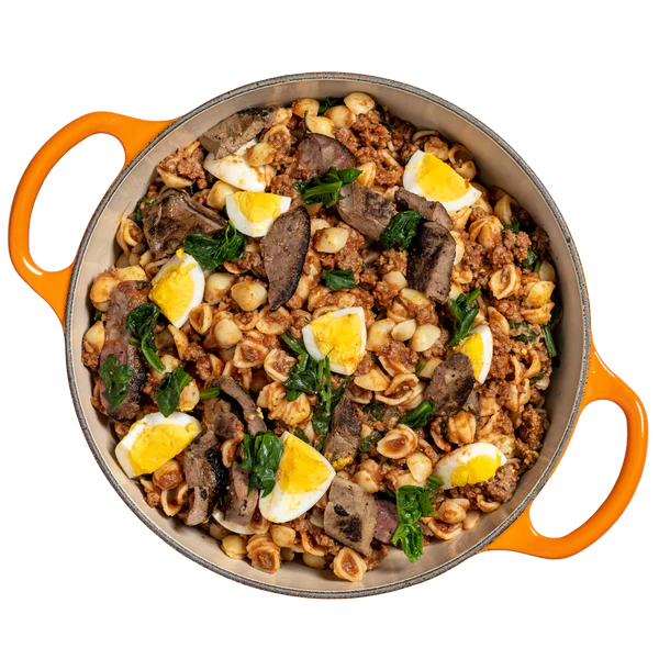 Lean ground beef, tomato purée, spinach, water, enriched semolina pasta, egg, beef liver, hemp seed oil, dicalcium phosphate, calcium carbonate, amino acid chelated minerals (zinc, iron, copper, manganese), magnesium oxide, potassium iodide, a-tocopherol acetate, sodium selenite, vitamin B12, vitamin A palmitate, niacin, calcium pantothenate, riboflavin, thiamine hydrochloride, vitamin D3, folic acid, pyridoxine hydrochloride, omega-3 fish oil (anchovy). Formulated to meet the NRC and AAFCO dog nutrient profiles for maintenance*