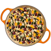 A festive dinner of ground turkey meat and chicken giblets (liver and heart) is complemented with a tasty medley of butternut squash, russet potatoes and spinach.