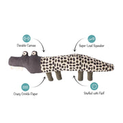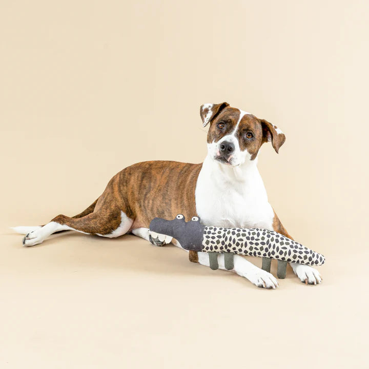 Our “Croc My World” dog toy is the perfect playdate for your pup. Featuring durable cotton canvas, a super loud squeaker, crazy crinkle paper, and printed with water based and non-toxic ink, this toy was designed with interactive play in mind and a look that complements modern home décor. Whether you squeak, crinkle, or toss it, this toy will make playtime a big croco-deal.