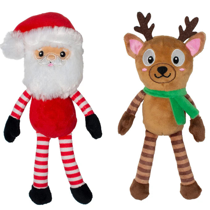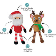 Sleigh-in it! Our “Friends at Frost Sight” 2 piece plush toy set is perfect for playtime, anytime. Made with a super loud squeaker and crazy crinkle paper in each toy, this set was designed with interactive play in mind. Whether you squeak, crinkle, or toss them, this duo will make your pup super santa-mental. Great for all dog sizes and not intended for aggressive chewers.