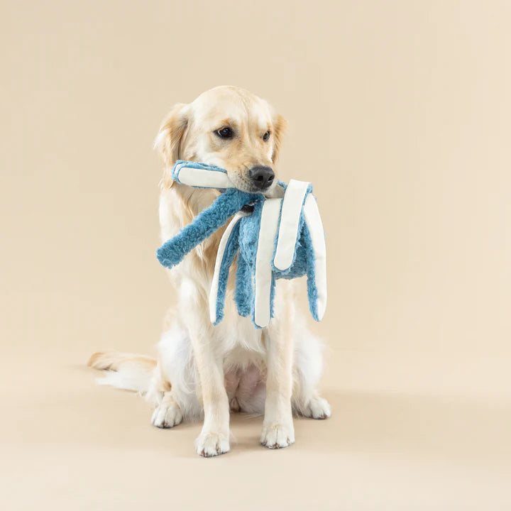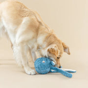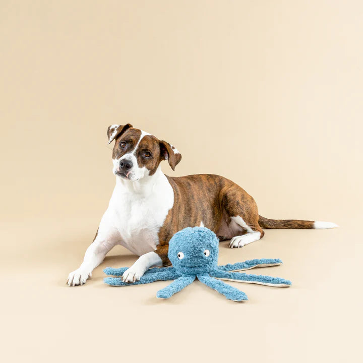 Our “Long Time No Sea” earth friendly dog toy is the perfect playdate for your pup. This toy was designed with interactive play in mind and a look that complements modern home décor (and the planet!) using non-toxic cotton canvas, soy faux fur, spun-recycled water bottle filling, a TPR spikey squeaker ball, and crazy crinkle paper. Whether you squeak, crinkle, roll, or bounce it, this eco-friendly toy is ready to octo-play all day.