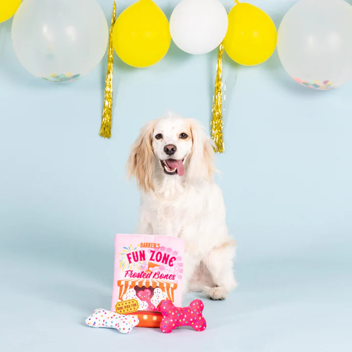 Time to clown around! Our “Fun Zone Bones” burrow bag plush toy set is perfect for high-energy pups that enjoy interactive puzzle toys. This set includes 1 burrow bag with crazy crinkle paper and 2 mini toys with loud squeakers. Keep dogs entertained and occupied with hide-and-seek fun: simply hide the mini toys inside the burrow bag, squeak a mini toy or crinkle the bag, and watch your dog try to figure out how to pull them out. This boredom buster will keep your pup searching for these sweet treats!