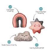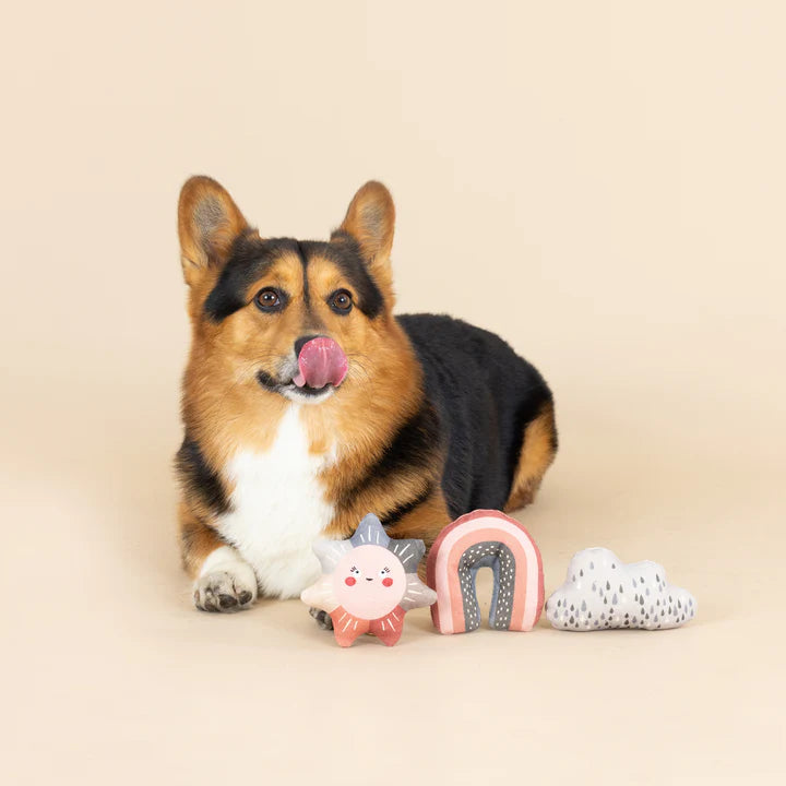 Our “Rain Or Shine” 3 piece mini toy set is the perfect playdate for your pup. Featuring durable cotton canvas, a super loud squeaker, crazy crinkle paper, and printed with water based and non-toxic ink, these toys were designed with interactive play in mind and a look that complements modern home décor. Whether you squeak, crinkle, or toss them, this trio won't let any weather get in the way of playtime.