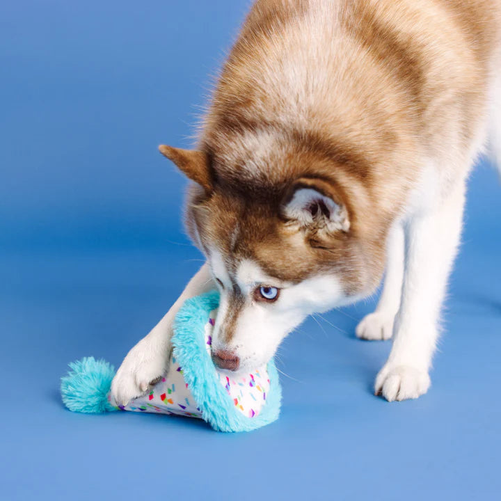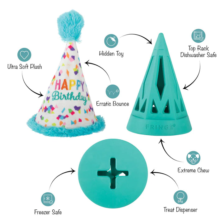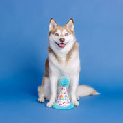 Ready to join the Dura Club? Our "Yappy Barkday!" rubber dog toy is for pups that love to work for their treats, chew, and play lots of fetch. Made with a plush exterior, a hidden natural rubber treat dispenser puzzle, and an erratic bounce, this toy was created for long-lasting interactive play. Once your pup chews through the plush, they'll find a treat dispenser puzzle toy. Simply fill it with treats or thread it with a bully stick, then toss it for some fetchin' fun to keep your pup busy trying to get them out. Now that sounds like the birthday gift that keeps on giving!