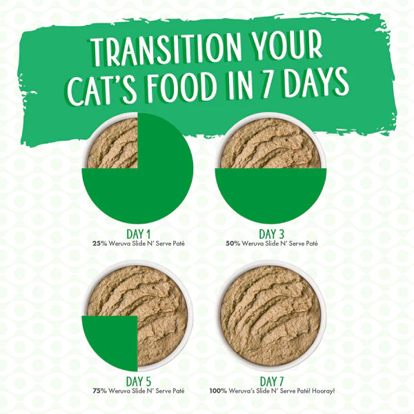 Despite how much your feline friends ask for Weruva's high-quality foods, it's best to transition them gradually onto a new food over a week. Start by mixing a small amount of Weruva in with their old food and slowly increase the amount of Weruva fed over 7 days. This will help your kitty to adjust to their new Weruva foods – Because WeLuvya