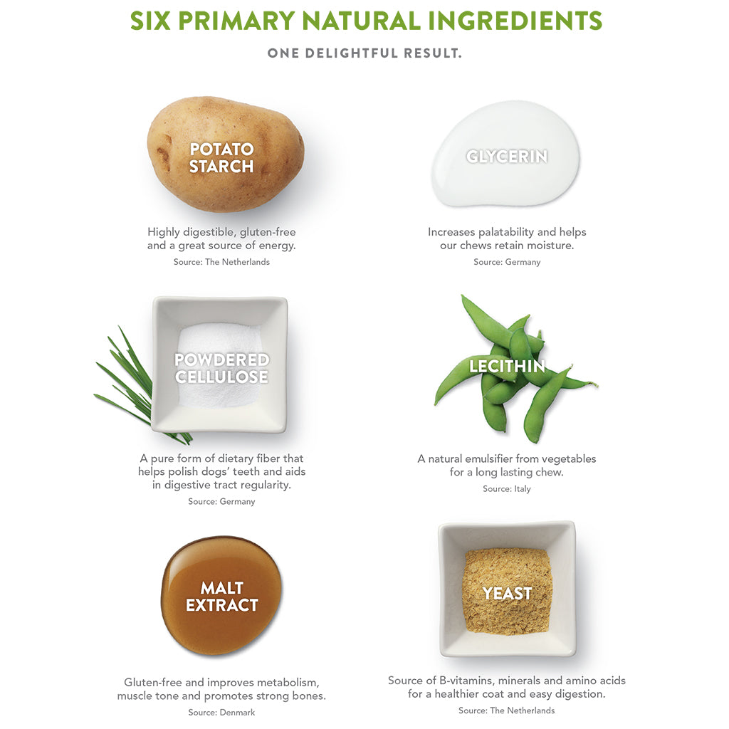 - Edible, vegetarian, gluten-free dental treat is a healthy option for dogs with gluten intolerance or food sensitivities.