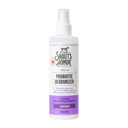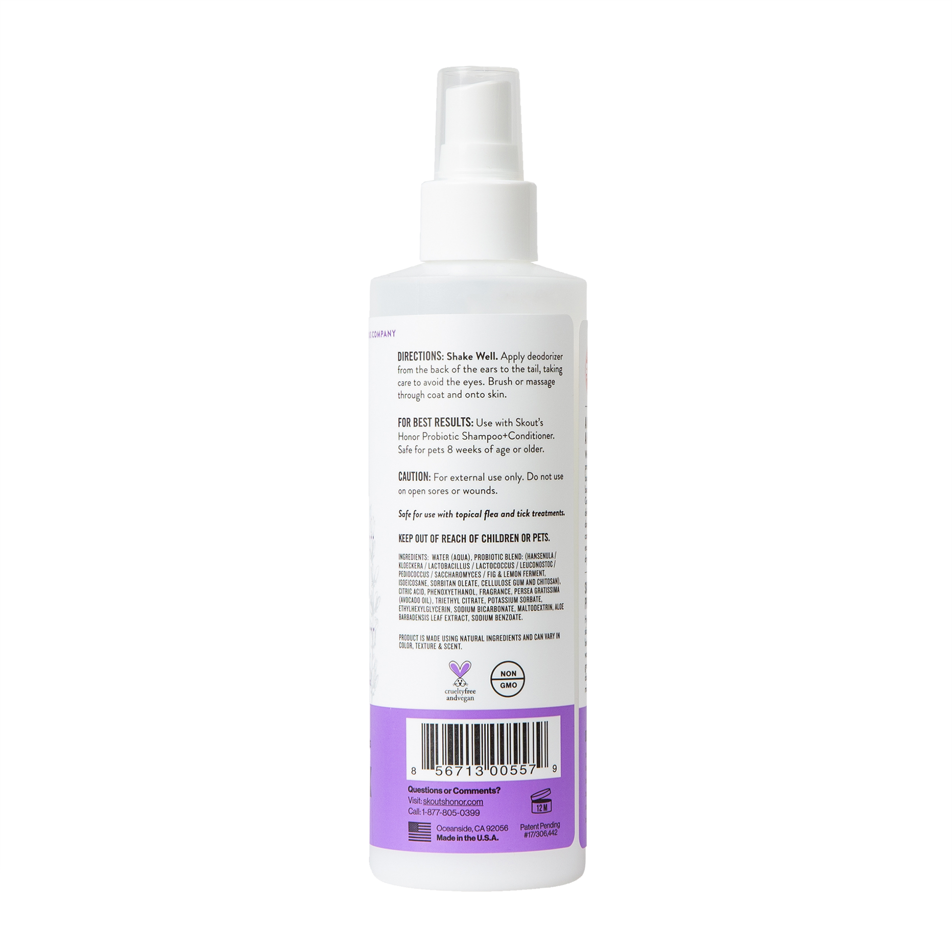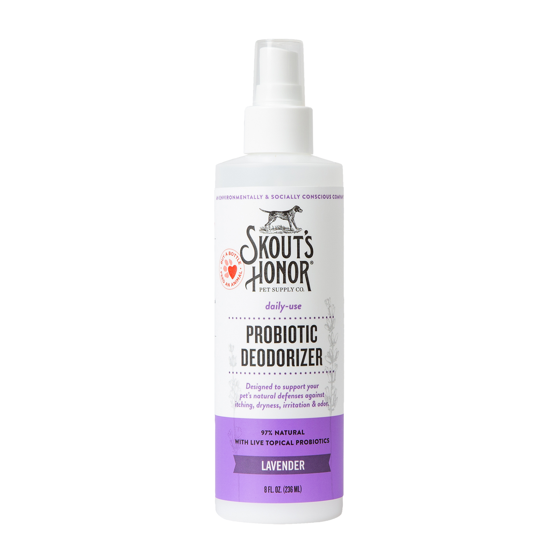 Our deodorizing spray hydrates and deodorizes the skin and coat for a fresher, better-smelling pet in between washes. It contains avocado oil and topical probiotics that help support a healthy microbiome to defend against common skin problems such as itching, odor, dryness, dandruff, hot spots, yeast and excessive shedding.