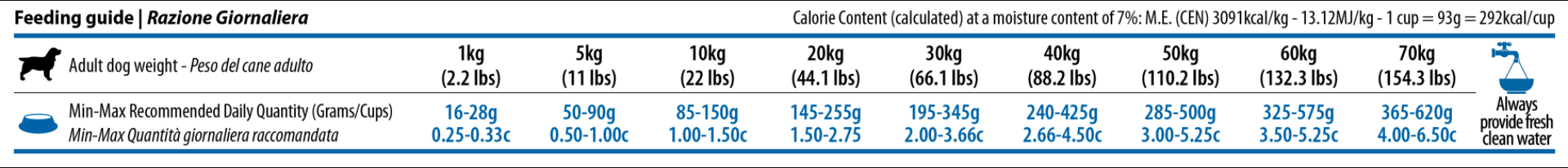 Crude Protein (min): 28.00%; Crude Fat (min): 8.00%; Crude Fiber (max): 8.20%; Moisture (max): 9.00%; Ash (max): 7.90%; Docosahexaenoic Acid (DHA) (min): 0.12%; Eicosapentaenoic Acid (EPA) (min): 0.10%; Calcium (min): 0.90%; Phosphorus (min): 0.80%; Potassium (min): 0.65%; Sodium (min): 0.30%; Magnesium (min): 0.12%; Omega-6 Fatty Acids* (min): 1.20%; Omega-3 Fatty Acids* (min) 0.25%; Glucosamine* (min): 1200mg/kg; Chondroitin sulfate* (min): 900mg/kg. *Not recognized as an essential nutrient by the AAFCO Dog Food Nutrient Profiles.