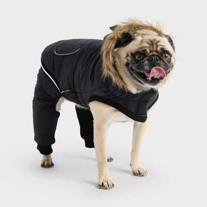 The GF PET® Creekside 2-piece Dog Snowsuit is a staple for the cold weather. The pants are detachable, so you can just use them only when needed! Water-resistant with warm fleece lining throughout to face any weather! Stay safe and warm with the reflective detail and vegan fur-trimmed hood, worn up or tacked down. The pants are extendable and the coat with faux pockets is super adjustable with patented Elasto-Fit® technology!