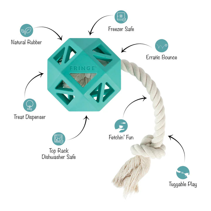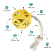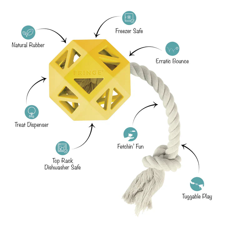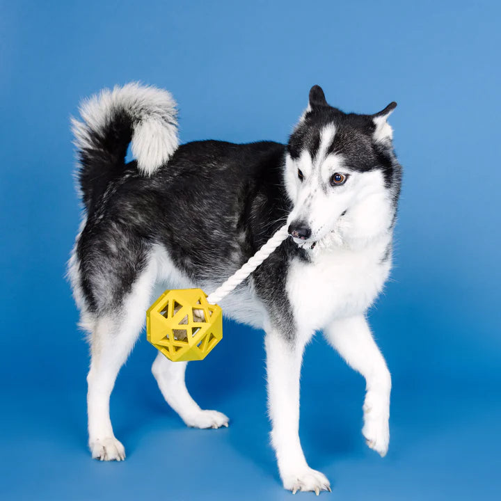 Ready to join the Dura Club? Our "Pull My Way" rubber dog toy is for pups that love to work for their treats, chew, and play lots of fetch. Made with natural rubber, a treat dispenser, tuggable rope, and an erratic bounce, this toy was created for long-lasting interactive play. Simply toss it for some fetchin' fun or fill it with treats to keep your pup busy trying to get them out!