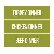 Our three most popular dinner recipes in one box. Complete canine nutrition makes meal planning easy for dogs and puppies alike! The Dinner box contains Chicken Dinner, Turkey Dinner and Beef Dinner. Meal planning made easy!