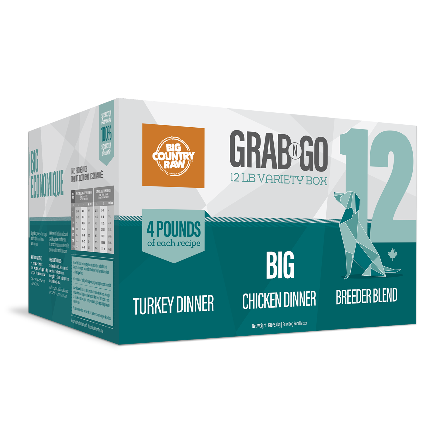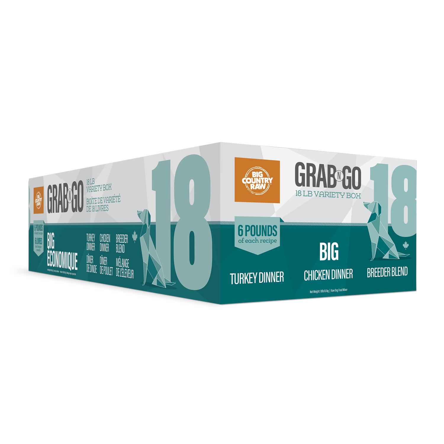It really is a big deal! Our number 1 best selling Grab n Go for more than a decade. Three unique recipes are great choice when making the transition to raw or as a starting point for your poultry-loving dog's menu. The Big box contains Chicken Dinner, Turkey Dinner and Breeder Blend.