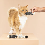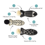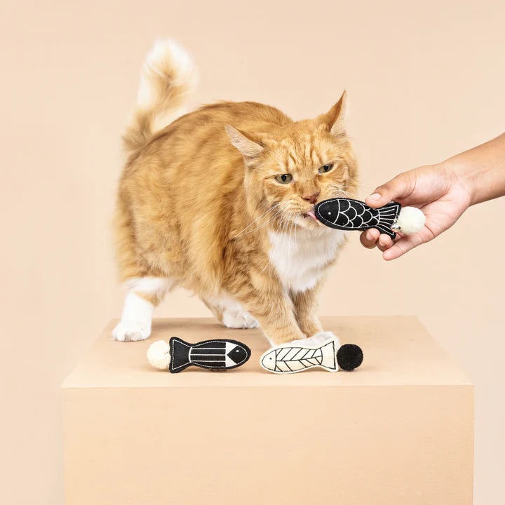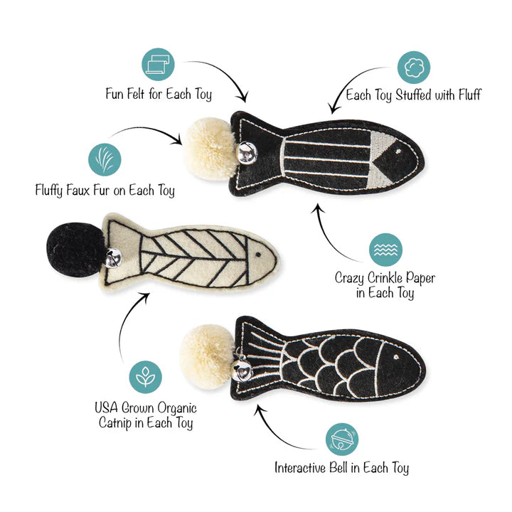 Our “Off the Scales” 3 piece mini toy set is purrfect for the playful kitty. Made with embroidered felt details, North American grown catnip, crazy crinkle paper, bells, and pom poms, these toys were designed with interactive play in mind and a look that complements modern home décor. Whether your cat likes to pounce, bat, or chase, this trio will make playtime go swimmingly.