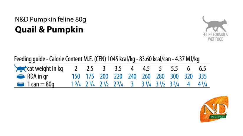 N&D Pumpkin Cat Quail & Pumpkin Recipe is formulated to meet the nutritional levels established by the AAFCO Cat Food Nutrient Profiles for maintenance. 100% Satisfaction Guaranteed.