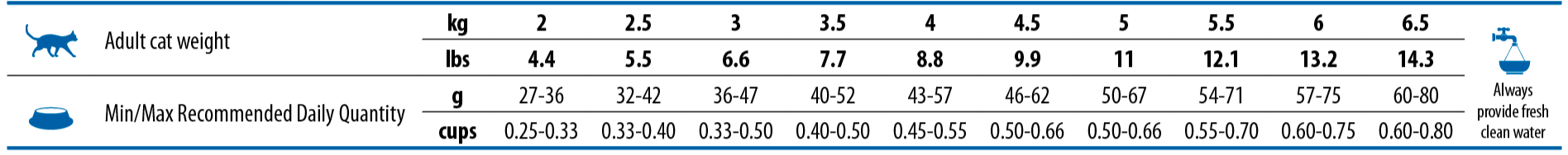 crude protein 31.00%; crude fat 11.00%; crude fibres 6.50%; moisture 8.00%; crude ash 8.20%; Calcium 1.10%; Phosphorus 0.90%; Magnesium 0.09%; Omega-6 2.00%; Omega-3 0.40%; DHA 0.15%; EPA 0.10%; Taurine 0.18%.