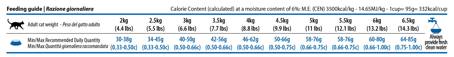 Guaranteed Analysis: Crude Protein (min): 35.00%; Crude Fat (min): 10.00%; Crude Fiber (max): 6.50%; Moisture (max): 8.00%; Ash (max): 8.20%; Docosahexaenoic Acid (DHA) (min): 0.15%; Eicosapentaenoic Acid (EPA) (min): 0.10%; Calcium (min): 1.10%; Phosphorus (min): 0.90%; Potassium (min): 0.60%; Sodium (min): 0.50%; Magnesium (min): 0.07%; Omega-6 fatty acids* (min): 2.00%; Omega-3 fatty acids* (min): 0.40%. *Not recognized as an essential nutrient by the AAFCO Cat Food Nutrient Profiles.