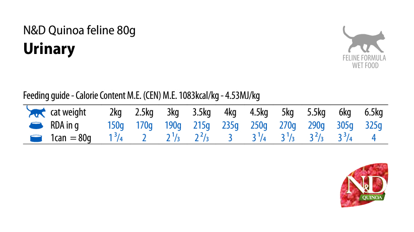 N&D Quinoa Cat Urinary Recipe is formulated to meet the nutritional levels established by the AAFCO Cat Food Nutrient Profiles for maintenance. 100% Satisfaction Guaranteed.