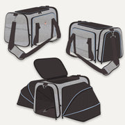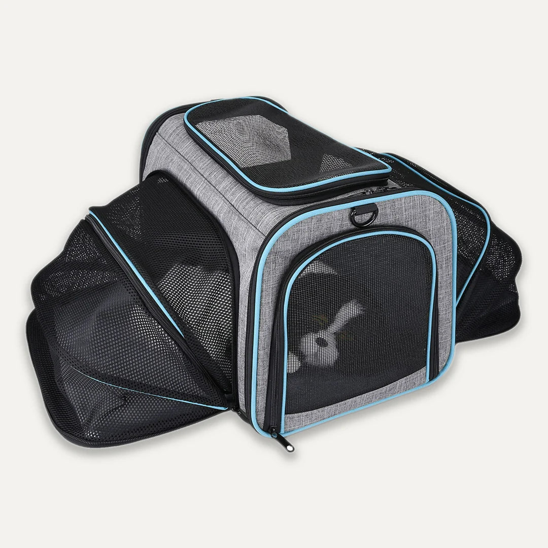 Multifunctional Carrier with 2 front pockets. The 4-way expansions providing more room for your pets to move around. The mesh extensions give your pet better airflow and visibility.