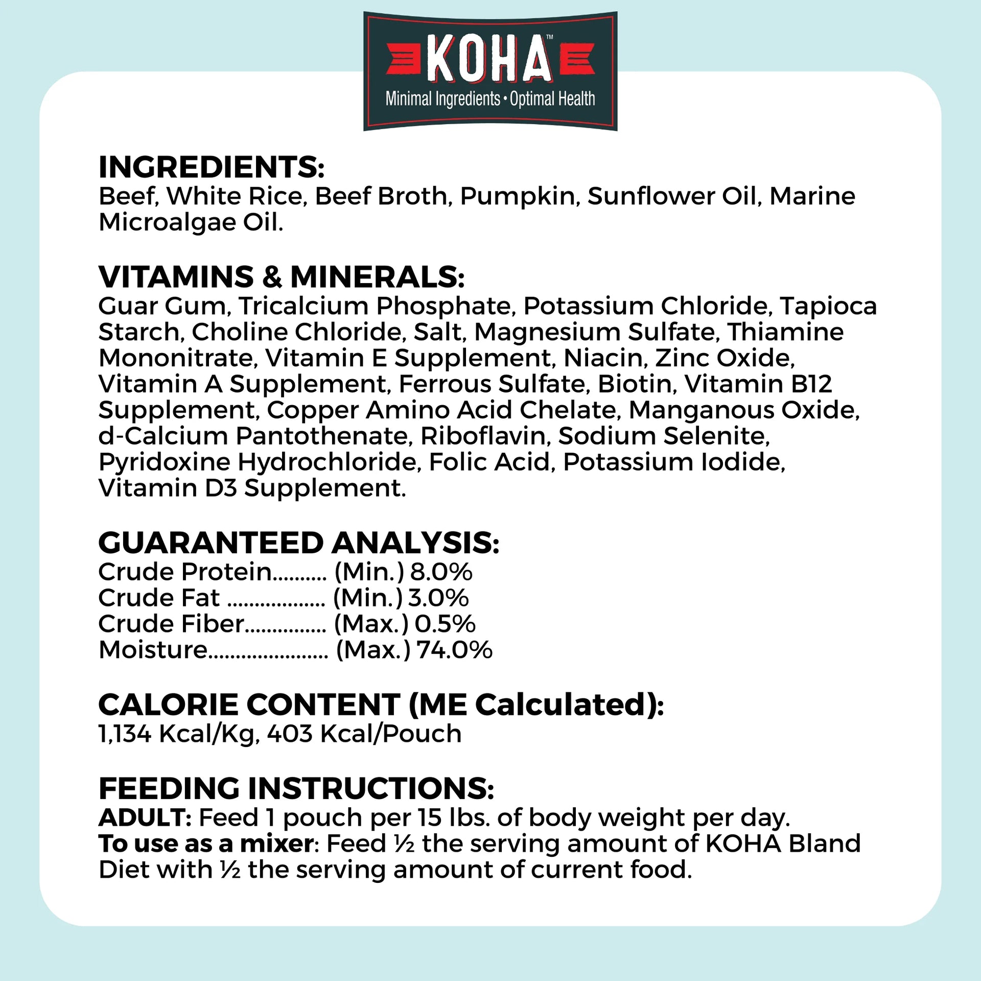 To use as a mixer: Feed ½ the serving amount of KOHA Bland Diet with ½ the serving amount of current food.