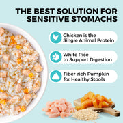 Chicken Breast, White Rice, Chicken Broth, Pumpkin, Sunflower Oil, Tricalcium Phosphate, Guar Gum, Tapioca Starch, Potassium Chloride, Choline Chloride, Salt, Marine Microalgae Oil, Magnesium Sulfate, Thiamine Mononitrate, Vitamin E Supplement, Ferrous Sulfate, Niacin, Zinc Oxide, Vitamin A Supplement, Biotin, Vitamin B12 Supplement, Copper Amino Acid Chelate, Manganous Oxide, D-Calcium Pantothenate, Riboflavin, Sodium Selenite, Pyridoxine Hydrochloride, Folic Acid, Potassium Iodide, Vitamin D3 Supplement.