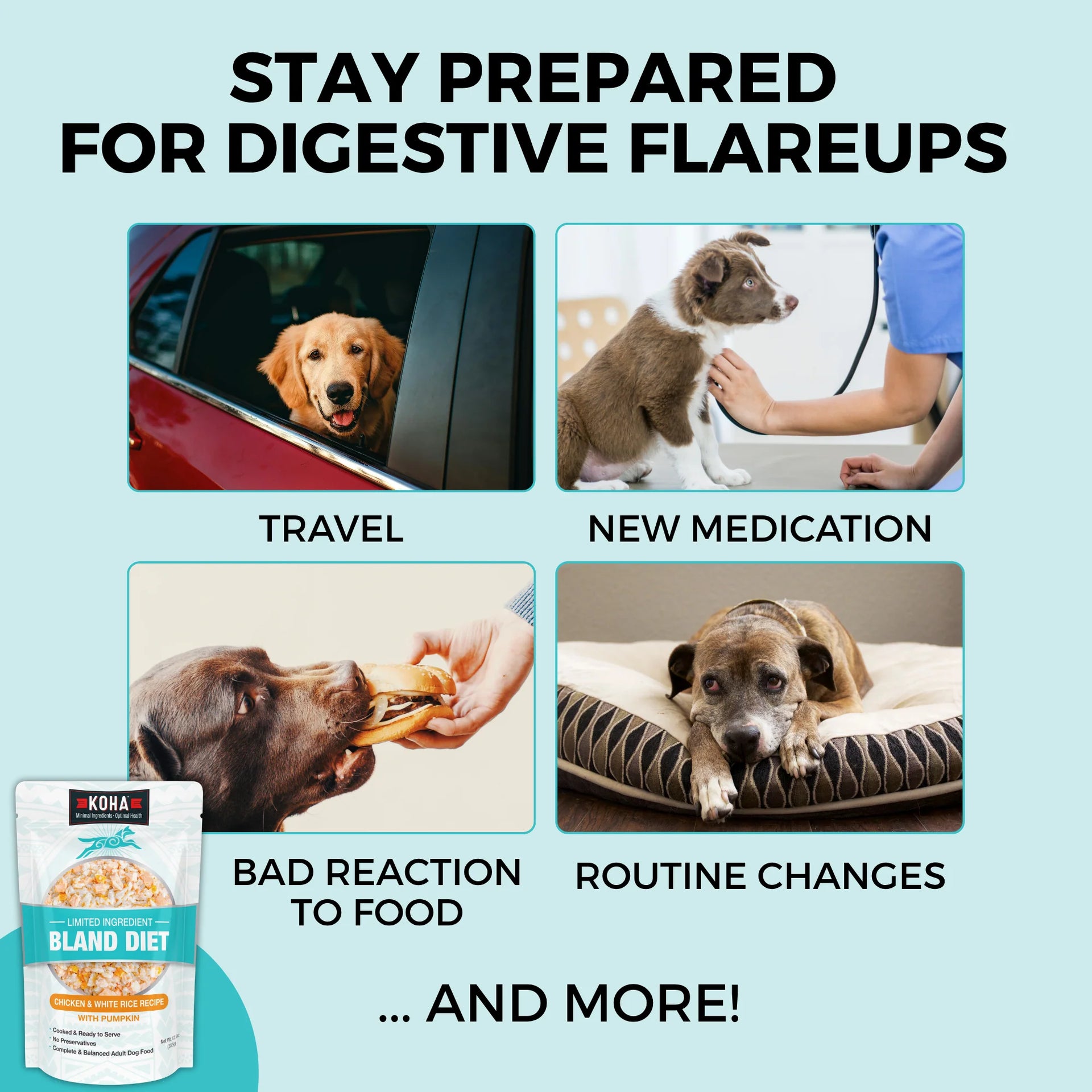 KOHA Bland Diet for dogs is ideal for dogs with upset stomach, loose stool, or diarrhea. This gently formulated limited ingredient dog food recipe has just one protein source for easy digestion. It also includes white rice and pumpkin to support healthy stools and regularity.