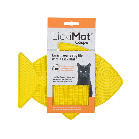 MIMICS CAT'S PREDATORY FEEDING – LickiMat Casper enriches feeding time for cats by allowing greater activity, like they would experience in the wild. LickiMat Casper stops "whisker stress" and allow your cat to feed in a crouching position with a full view of their surrounds, reducing stress and anxiety. The pockets are designed to promote licking action to extract food and slow down eating and make meals or treats last a long time.