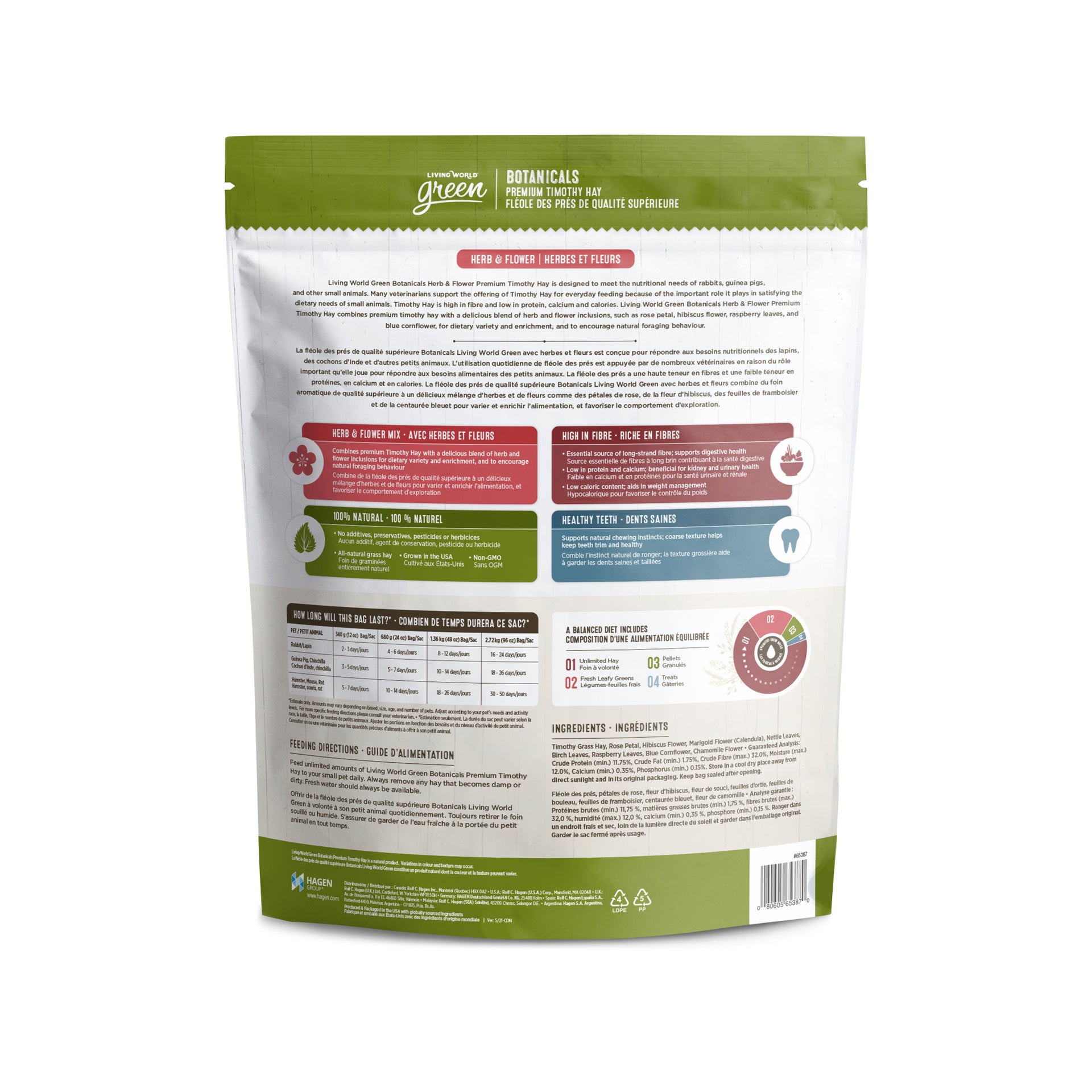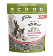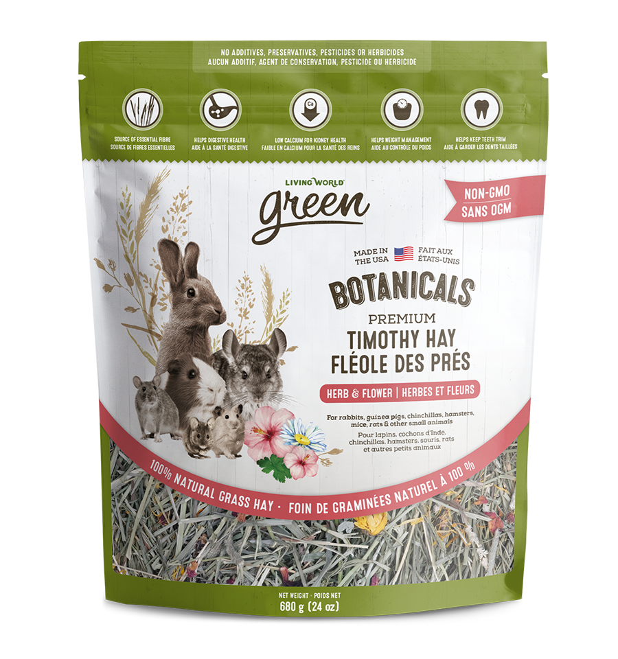 Living World Green Botanicals Herb & Flower Premium Timothy Hay is designed to meet the nutritional needs of rabbits, guinea pigs, and other small animals. Many veterinarians support the offering of Timothy Hay for everyday feeding because of the important role it plays in satisfying the dietary needs of small animals. Timothy Hay is high in fibre and low in protein, calcium and calories. Living World Green Botanicals Herb & Flower Premium Timothy Hay combines premium timothy hay with a delicious blend of herb and flower inclusions, such as rose petal, hibiscus flower, raspberry leaves, and blue cornflower, for dietary variety and enrichment, and to encourage natural foraging behaviour.