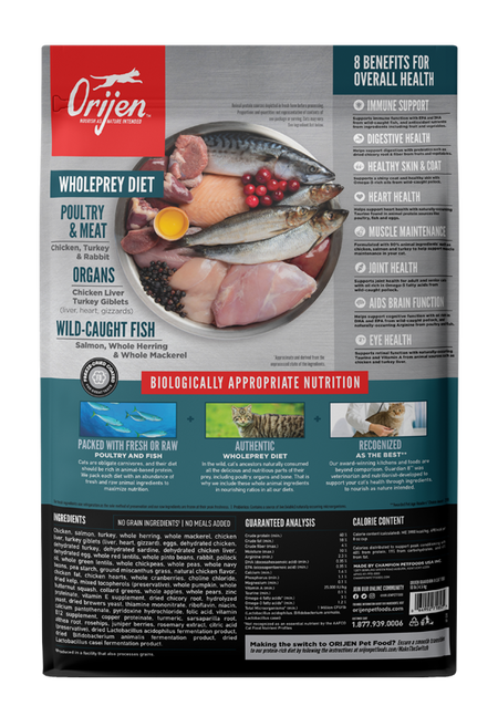 ORIJEN® Guardian 8 is a nourishing food specially formulated to address 8 common cat ailments through quality ingredients. Because of the abundance of fresh and raw WholePrey animal ingredients in this diet, less supplementation is needed to support your cat’s health for a lifetime. With 90%* premium animal ingredients, and 2/3 of those being fresh and raw, Guardian 8 contains nutritious ingredients that help support your cat’s overall health with 8 benefits. These benefits include Immune support, Digestive health support, Healthy skin & coat support, Muscle maintenance, Heart health, Joint health, Brain & cognitive function, and Eye health.